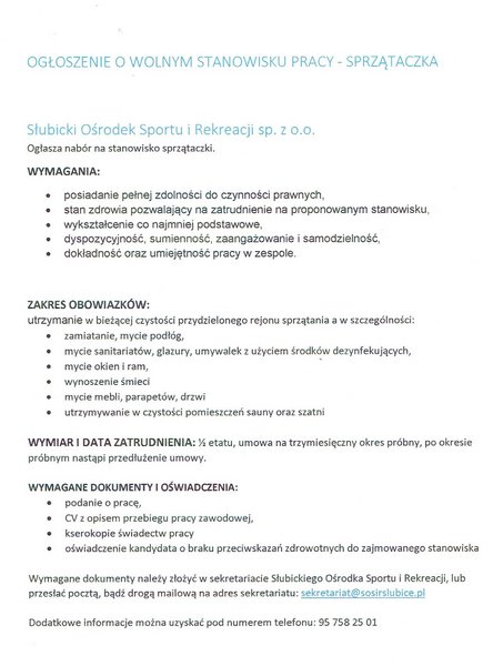 zarejestrowana w Sądzie Rejonowym w Zielonej Górze VIII Wydział Gospodarczy Krajowego Rejestru Sądowego - KRS 0000415548 REGON 081017397, NIP 5981630216, Kapitał zakładowy 19 606 000,00 zł 69-100 Słubice ul. Sportowa 1 tel. 95 7582501, fax. 95 7584778, e-mail: sekretariat@sosirslubice.pl