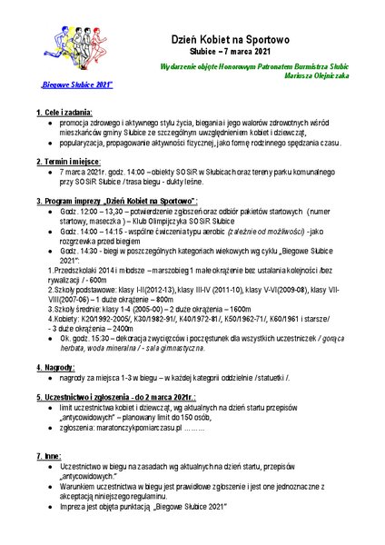 7 marca 2021r. godz. 14:00 – obiekty SOSiR w Słubicach oraz tereny parku komunalnego przy SOSiR Słubice / trasa biegu - dukty leśne.