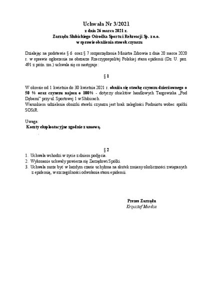 Zarządu Słubickiego Ośrodka Sportu i Rekreacji Sp. z o.o.