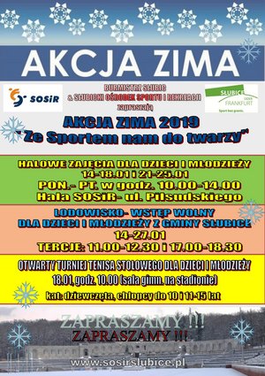 SOSiR Słubice wraz z Gminą Słubice zaprasza serdecznie dzieci i młodzież (przedszkola, szkoły podstawowe i gimnazja) z terenu naszej Gminy do bezpłatnego korzystania z lodowiska podczas zbliżających się Ferii Zimowych.