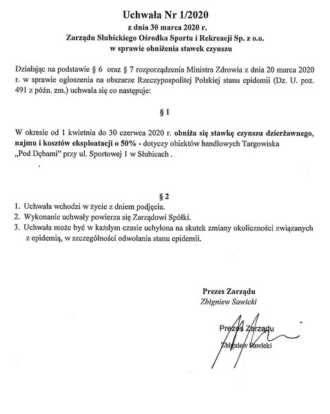 Uchwala Zarządu Słubickiego Ośrodka Sportu i Rekreacji Sp. z o.o. w sprawie obniżenia stawek czynszu.